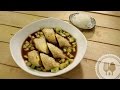 I created this version of pempek when I was living abroad where fish was much more expensive than it is in Indonesia. The result was a snack flavorful enough to keep my homesickness at bay. Recipe by Arfi Binsted Serve 16 Pieces Ingredients Pempek Dough 1 ¾ glass of seafood broth 1 ¼ glass of water 250 gr flour, sifted 4 medium sized chicken eggs 500 gr sago flour, sifted ½ tsp salt Sugar Filling 8 eggs ½ tsp garlic salt ¼ tsp ground pepper Cuko Sauce 3½-4 glasses of water Spice Paste for Cuko 12 garlic cloves 8 red curly chilies 5 red bird’s eye chilies 4 tsp dried shrimp, soaked in warm water 1 block of palm sugar 3 tbsp tamarind ½ tsp salt Steps 1. Pempek: Bring the seafood broth to boil with salt and sugar. Sprinkle in flour while stirring constantly until the mixture thickens and no lumps remain. Remove from heat. Stir until the mixture cools. Add eggs one by one while mixing at low/medium-speed with mixer. Sprinkle in sago flour while mixing. Do this until the dough is smooth and soft. 2. Shape the dough into balls the size of either golf or tennis balls. Hold in palm, curling fingers around ball shape and pressing in with thumb until the ball looks like a bowl. Fill the hollow of the bowl shape with whisked eggs and seal back into a closed ball shape. 3. Put the ball or pempek dos into boiling water. Let it balls surface and cook for 20mins until the ball is chewy and the egg filling cooked. Remove from heat. Drain water. 4. Cuko: Bring water to boil with spice paste. Lower the heat and let the cuko sauce cook down and thicken. Taste the sauce and strain it. 5. Serving: Fry or steam the pempek dos. Serve with cuko sauce and chopped cucumber. It is also can be served with yellow or angel-hair noodles. ----- Resep Pempek Dos Pempek dos ini tak kalah sedap dan mampu melepaskan rindu saya pada pempek di kampung halaman. Resep dari Arfi Binsted Porsi 16 Bahan Pempek 1¼ gelas air 250 gram tepung terigu, ayak 4 butir telur ayam ukuran sedang 500 gram tepung sagu, ayak Garam Gula pasir Isi: Kocok Rata 8 butir telur ayam ½ sendok teh garlic salt ¼ sendok teh merica bubuk Ulek Halus 12 siung bawang putih 8 butir cabai merah keriting 5 butir cabai rawit merah 4 sendok teh ebi kering, rendam dalam air hangat 1 blok gula jawa 3 sendok makan asam jawa Garam Cuko 3½ - 4 gelas air Caranya 1. Pempek: Didihkan kaldu bersama air, garam,dan gula pasir. Masukkan tepung terigu sedikit demi sedikit sambil diaduk hingga rata dan tidak berbindil. Angkat. Aduk-aduk agar agak dingin. Masukkan telur satu per satu sambil kocok dengan mixer kecepatan lambat – sedang. Masukkan sagu sedikit demi sedikit sambil aduk hingga adonan kalis dan tidak lengket. 2. Bentuk adonan sebesar bola golf atau bola tenis. Letakkan di atas telapak tangan. Tekan bagian tengah bola adonan dengan ibu jari sementara jari-jari yang lainnya menekan-nekan sisi adonan sehingga menyerupai mangkuk. Isi mangkuk ini dengan kocokan telur lalu rapatkan. 3. Masukkan pempek dos ke dalam air mendidih, biarkan hingga terapung, masak selama 20 menit hingga adonan kenyal dan telur matang. Angkat. Tiriskan. 4. Cuko: Didihkan air bersama bumbu halus. Kecilkan api dan biarkan cuko masak dan mengental, cicipi rasanya. Saring. 5. Penyajian: Goreng pempek dos atau kukus. Sajikan dengan cuko, mentimun cincang. Jika suka dapat disajikan dengan mi kuning atau bihun rebus. Music Courtesy of Audio Network